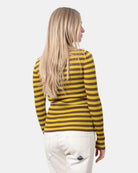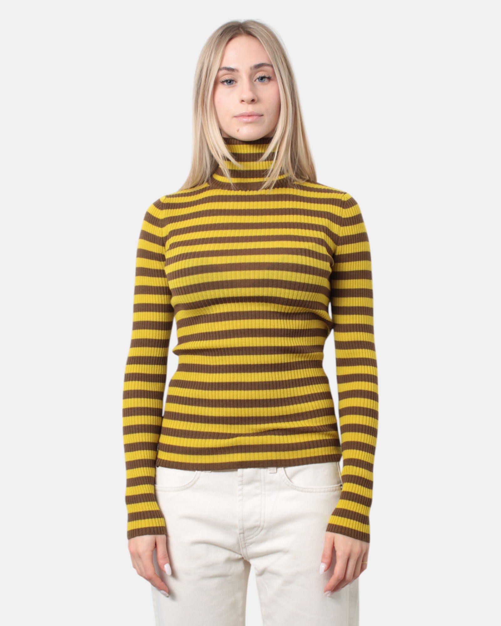 La maglia a dolcevita di Jucca presenta fantasia a righe in contrasto di colore, vestibilità slim, composta in 100% lana vergine. Si consiglia il lavaggio del capo a mano. La modella è alta 1,67 m e indossa una L
