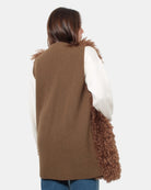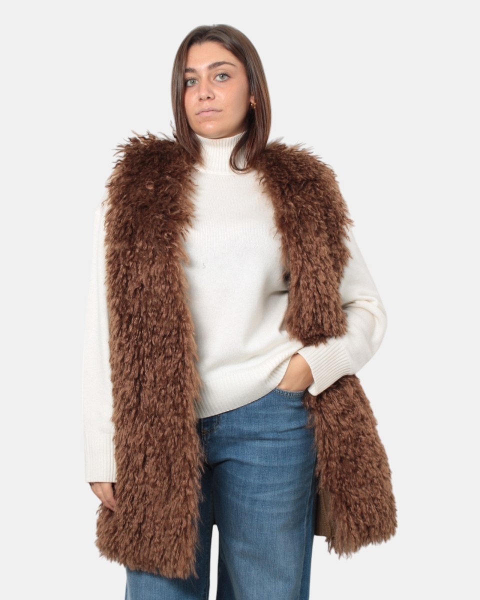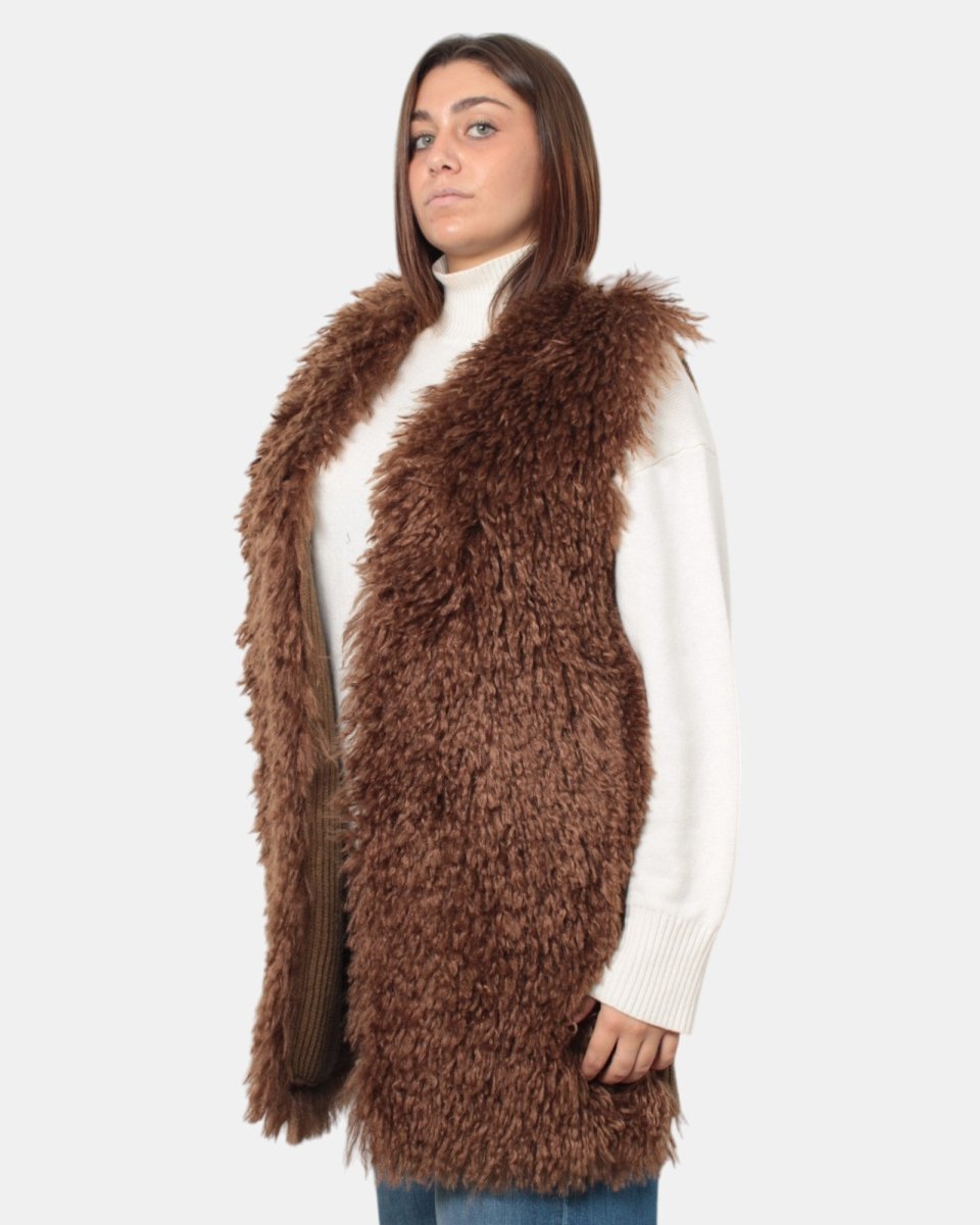 Il gilet di Jucca modello seppia presenta sul fronte pelo lungo in 100% poliestere e sul retro è composto per il 100% da lana vergine. Si consiglia lavaggio in lavanderie specializzate. La modella è alta 1,65 m e indossa una L