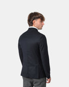La giacca con rever classico di Bottega Marchigiana presenta chiusura a due bottoni, con tasche a toppa, due spacchi laterali. Il modello è alto 179 cm e indossa una taglia 46. Il tessuto esterno della giacca è composto per il 17% da lana, 65% viscosa, per il 15% da altre fibre,3% elastan, la fodera è 100% viscosa. Si consiglia lavaggio a secco