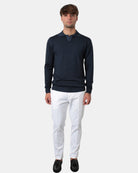 Il pantalone ''Louis'' di Be Able presenta due tasche america, chiusura con bottone e zip, sul retro presenta tasche a filetto con chiusura con pattina . Il tessuto è composto da 98% cotone e 2% elastan. Si consiglia lavaggio a mano. Il modello è alto 1,79 m e indossa una 32