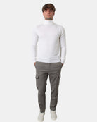 Il pantalone cargo modello ''Karl'' di Be Able presenta due tasche america e due tasche laterali con pattina e bottone, nella parte posteriore presenta due tasche a filo con bottone, con due cinghiette laterali. La chiusura è a zip con bottone. La composizione è 54% lana vergine, 44% poliestere e 2% elastan. Si consiglia lavaggio a secco. Il modello è alto 1,79 e indossa una 32