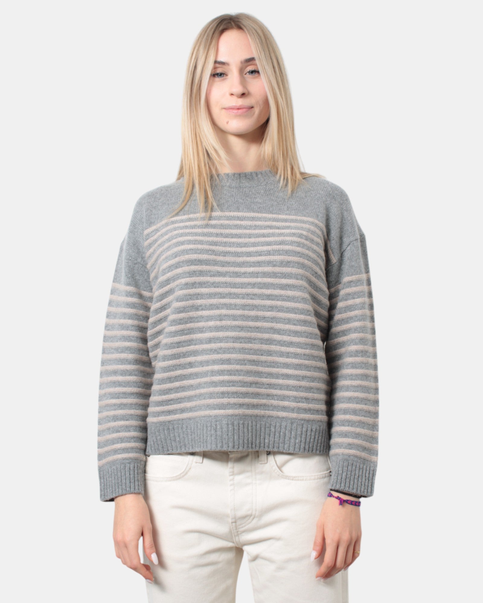 La maglia a girocollo di Hekla&Co presenta collo, fondo e polsi a costine, fantasia rigata, con fondo posteriore più lungo, vestibilità regolare, dalla mano morbida e calda dovuta alla sua composizione in 48% lana, 30% viscosa, 15% poliammide e 7% cashmere. Si consiglia il lavaggio a secco. La modella è alta 1,67 m e indossa una S