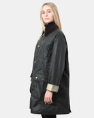 Il giaccone lungo di Barbour, nel classico tessuto in cotone spalmato, presenta collo in contrasto in velluto a costine, manica raglan, due tasche oblique e due tasche a toppa con pattina e chiusura in bottoni in ottone. Abbottonatura con bottoni a pressione e zip, sul retro presenta due spacchi con chiusura a bottoni. Internamente presenta la sua storica fantasia galles con tasca con chiusura a zip. Il suo tessuto è composto per il 100% da cotone lavato, mentre la fodera è in 65% poliestere e 35% cotone. Si consiglia lavaggio in lavanderia specializzata. La modella è alta 1.67 m e indossa una 10
