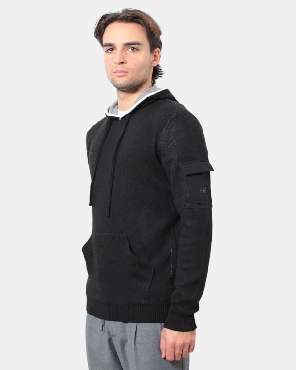 La felpa con cappuccio di PMDS presenta tascone centrale, taschino a filo con logo brand sul braccio sinistro, fondo e polsi a costine elastiche, collo a costine in contrasto di colore . La sua composizione è per il 50% in lana, 30% viscosa, 25% poliammide e 5% cashmere. Si consiglia lavaggio a mano. Il modello è alto 1,79 m e indossa una M