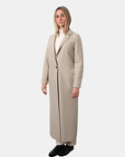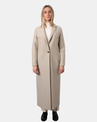 Il cappotto lungo di ''ANNIEPARIS'' presenta monopetto un bottone, due tasche a filo laterali con pattina e un taschino sul petto, presenta vestibilità slim, caratterizzato da un tessuto corposo e caldo dovuto alla sua composizione in 100% lana vergine. Si consiglia lavaggio a secco. La modella è alta 1,70 m e indossa una 40