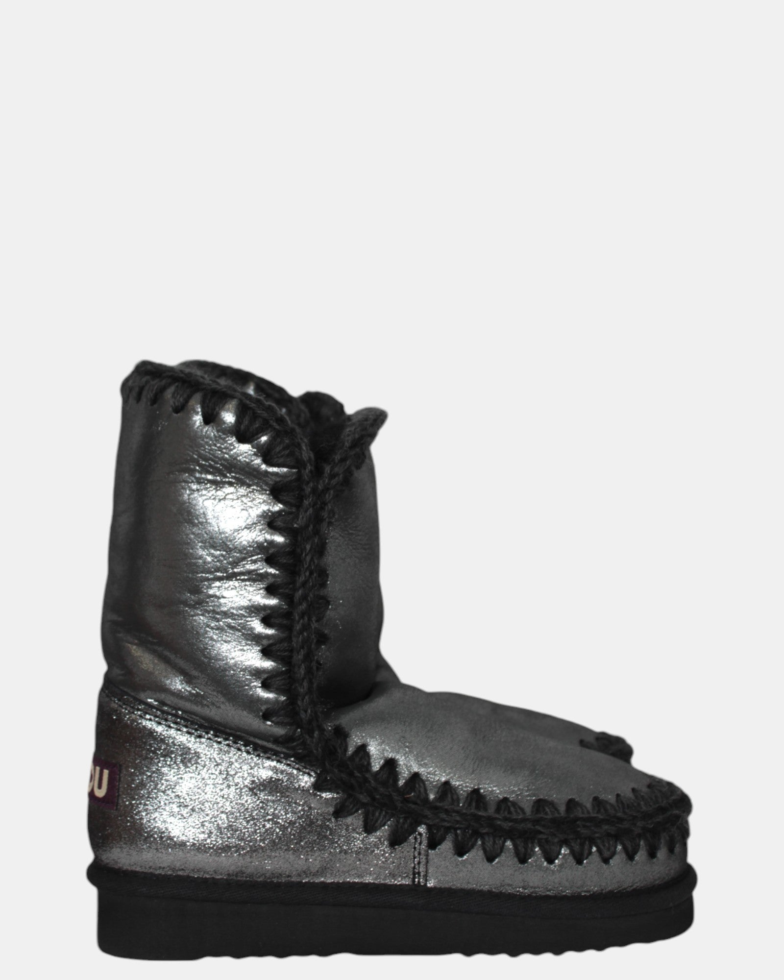 Lo stivaletto di Mou presenta tomaia con fantasia in pelle effetto argentato, con logo sul tacco, con cucitura in corda in rilievo, pelliccia calda interna e suola in gomma