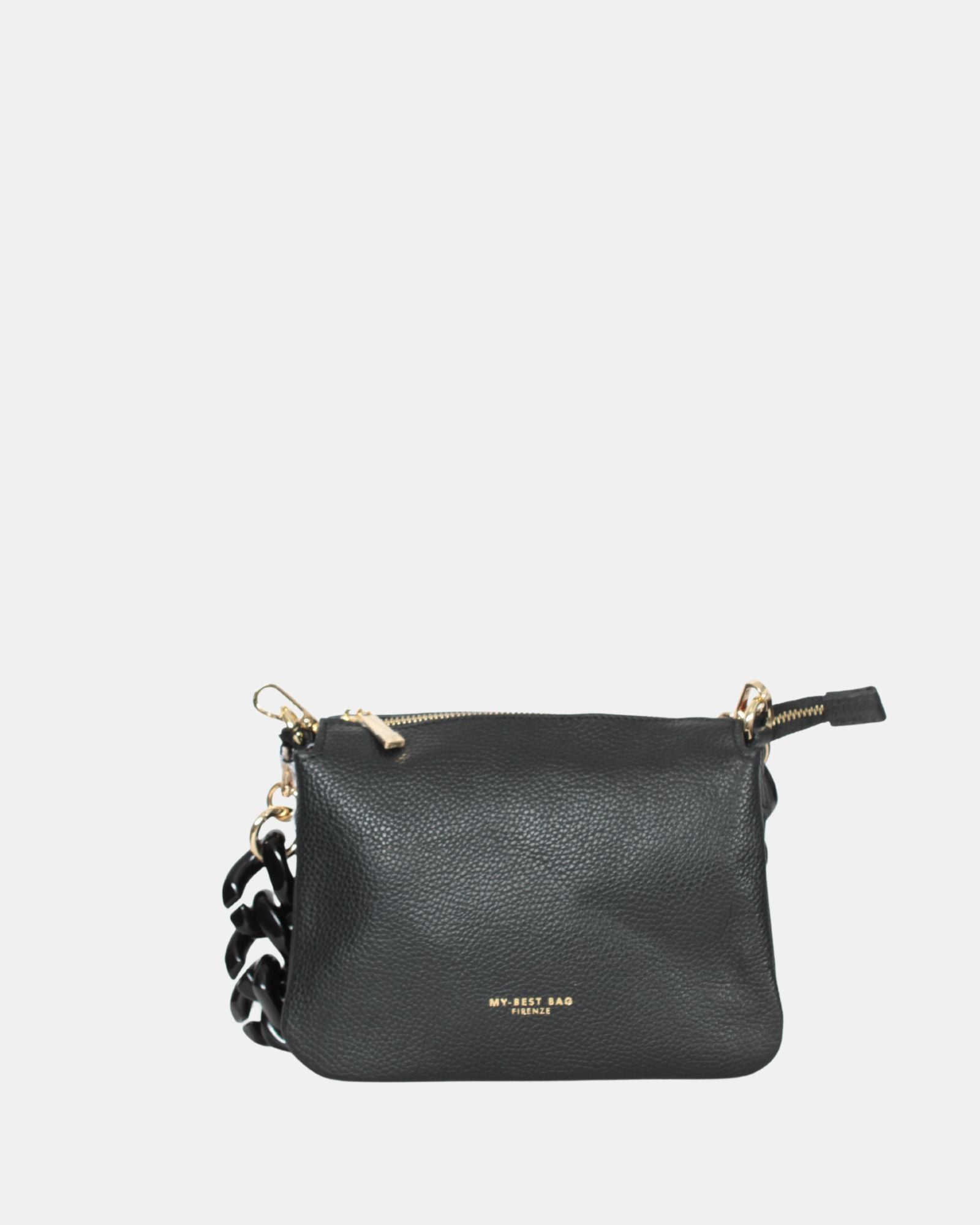 La borsa di My best bag presenta fantasia monocolore con tracolla lunga, chiusura con zip in ottone, internamente presenta tre tasche , tracolla in resina intrecciata con fibiette in ottone, composta per il 100% in ecopelle
