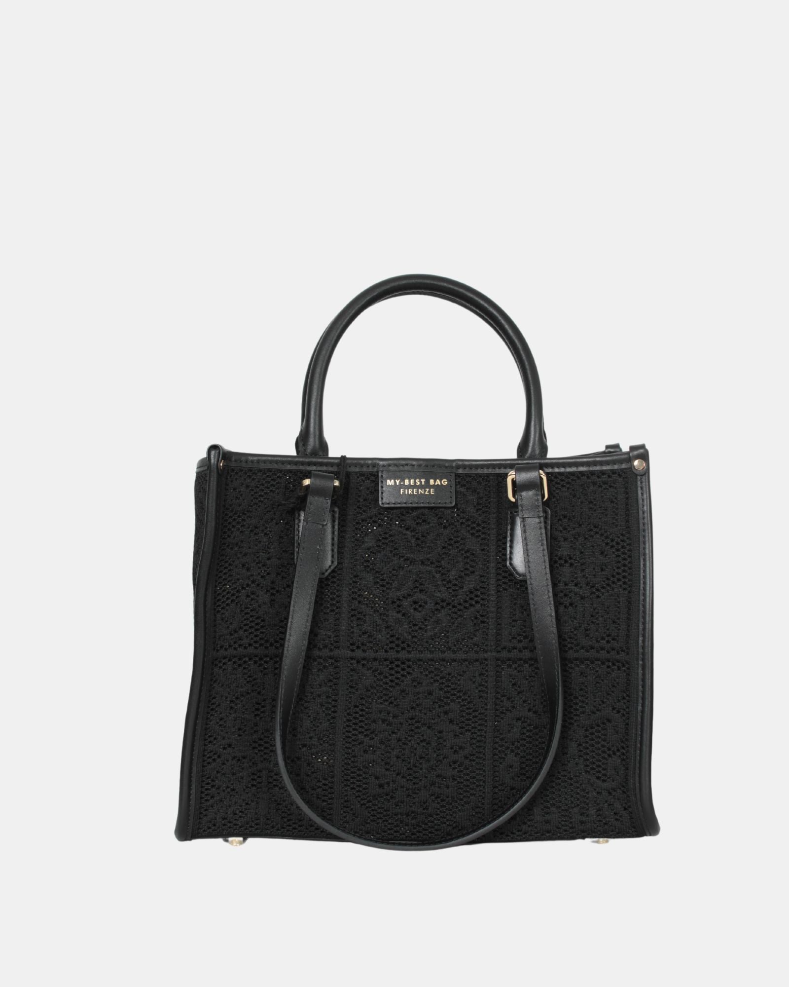 La borsa piccola di My best bag presenta fantasia '' Ossidiana '' traforata, con chiusura a zip interna, manici in ecopelle monocolore, all' interno presenta due tasche .