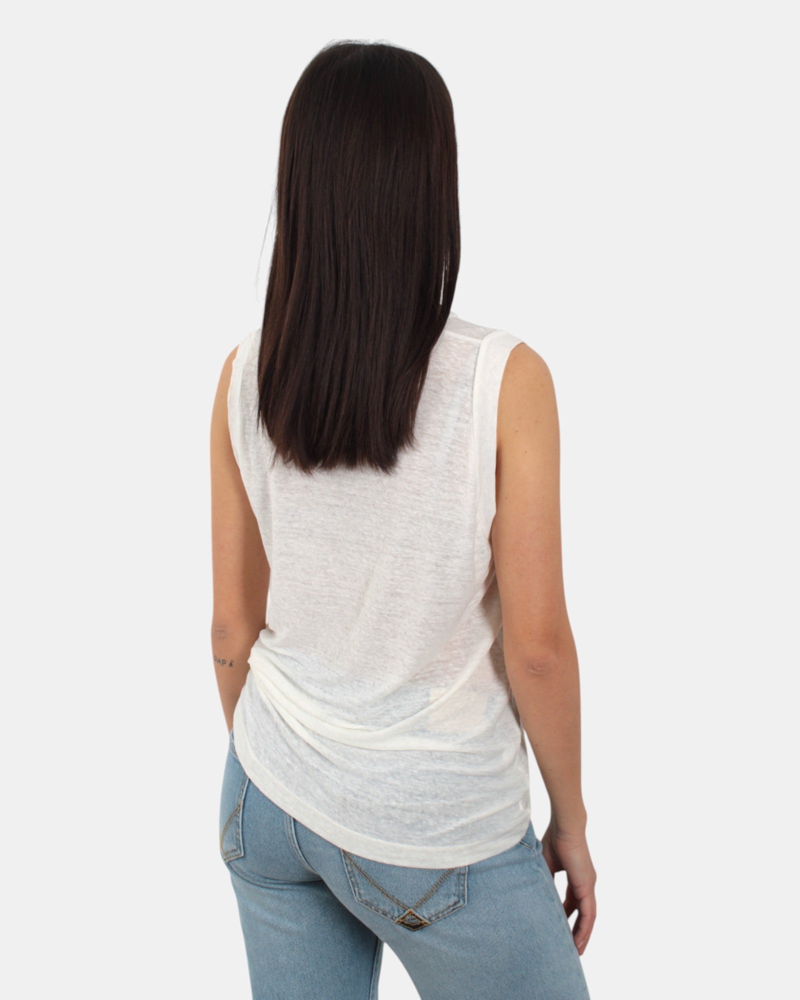 La canotta di Daniele Fiesoli presenta collo a costine, fantasia monocolore, dalla mano fresca dovuta alla sua composizione in 94% lino e 6% elastan. Si consiglia lavaggio a mano. La modella è alta 1,68 m e indossa una S