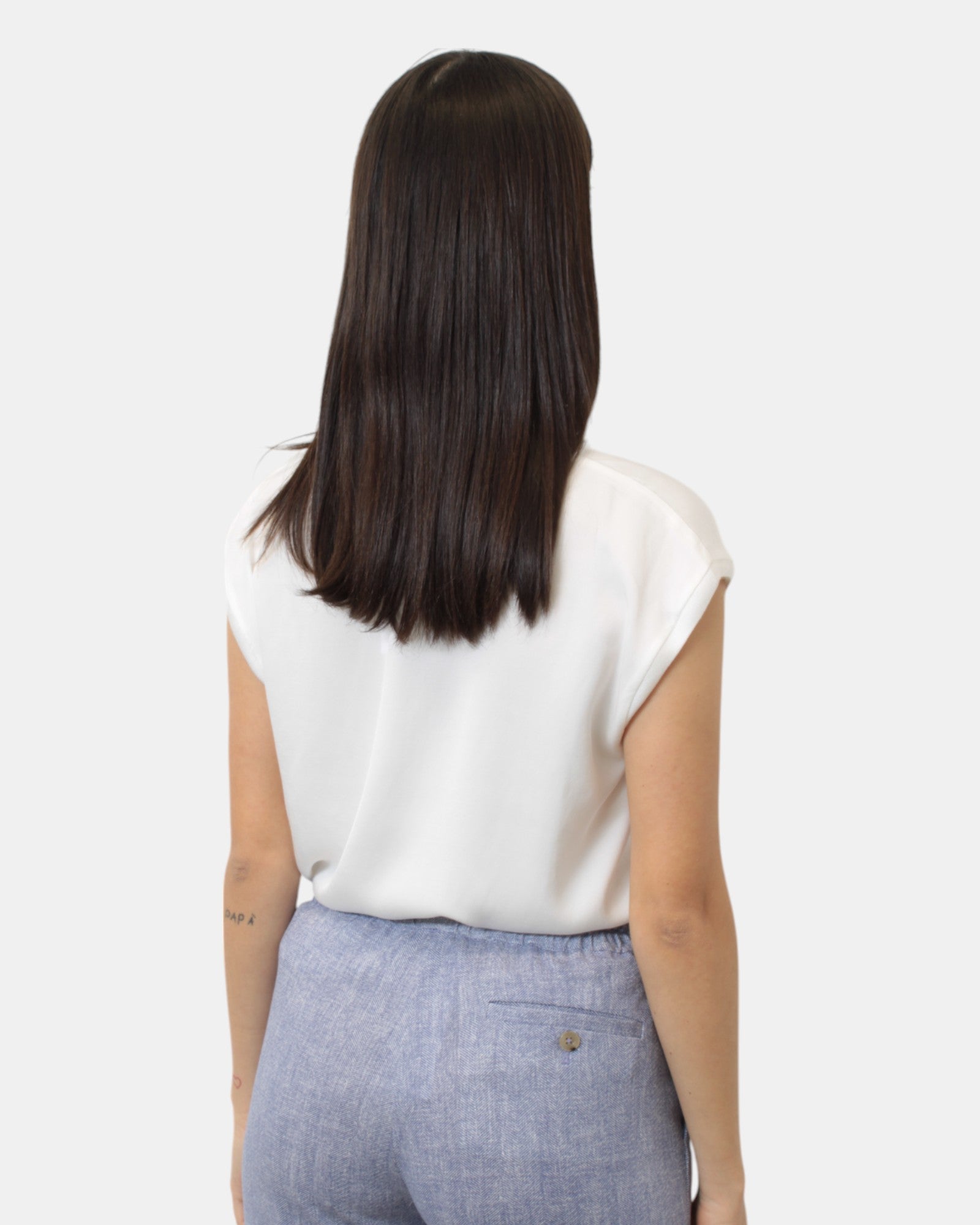 La canotta di Daniele Fiesoli presenta scollo a V, collo e fondo a costine, spacchetti laterali, dalla mano fresca dovuta alla sua composizione in 95% viscosa e 5% lino. Si consiglia lavaggio a massimo 30 gradi. La modella è alta 1,68 m e indossa una S