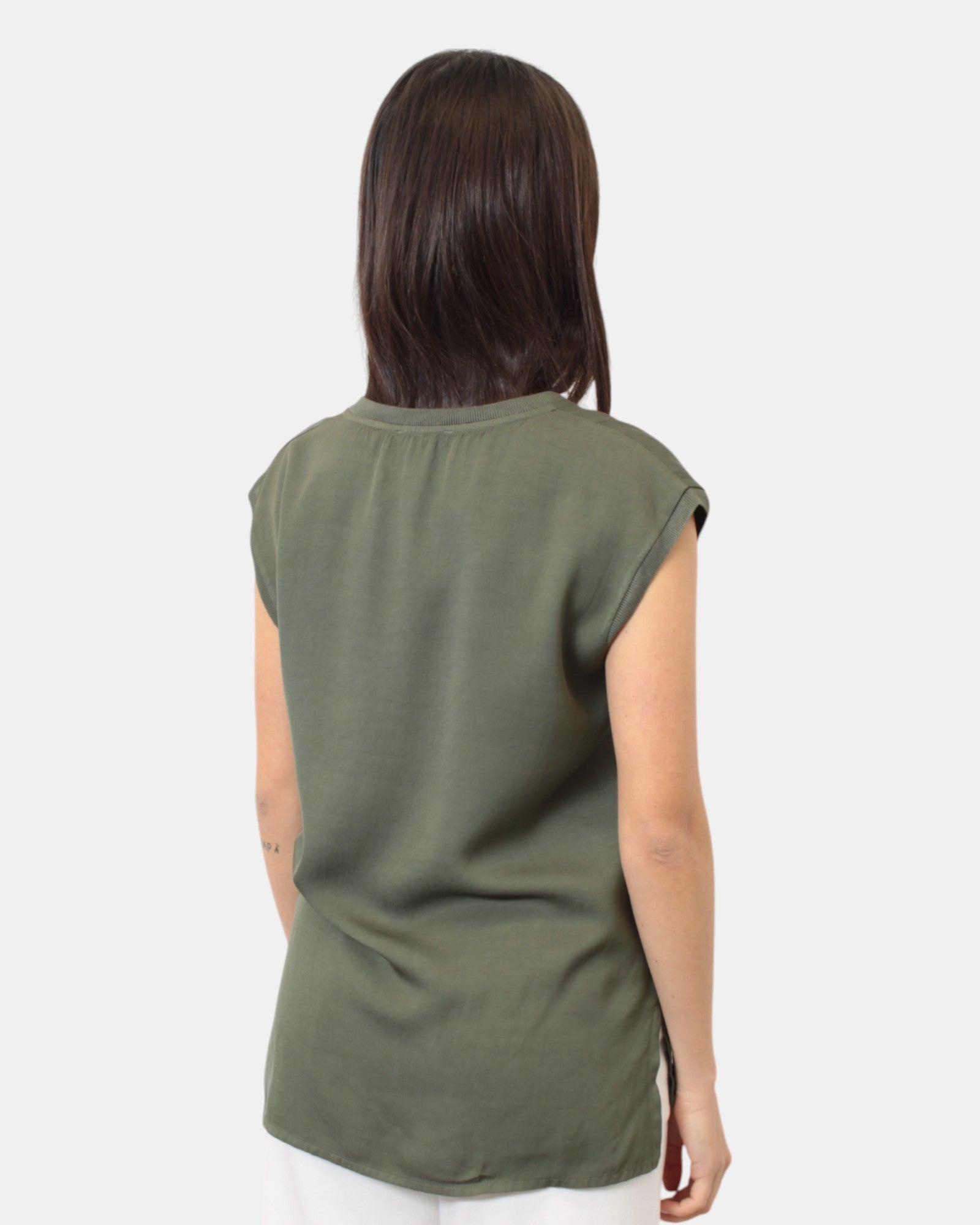 La canotta di Daniele Fiesoli presenta scollo a V, collo e fondo a costine, spacchetti laterali, dalla mano fresca dovuta alla sua composizione in 95% viscosa e 5% lino. Si consiglia lavaggio a massimo 30 gradi. La modella è alta 1,68 m e indossa una S