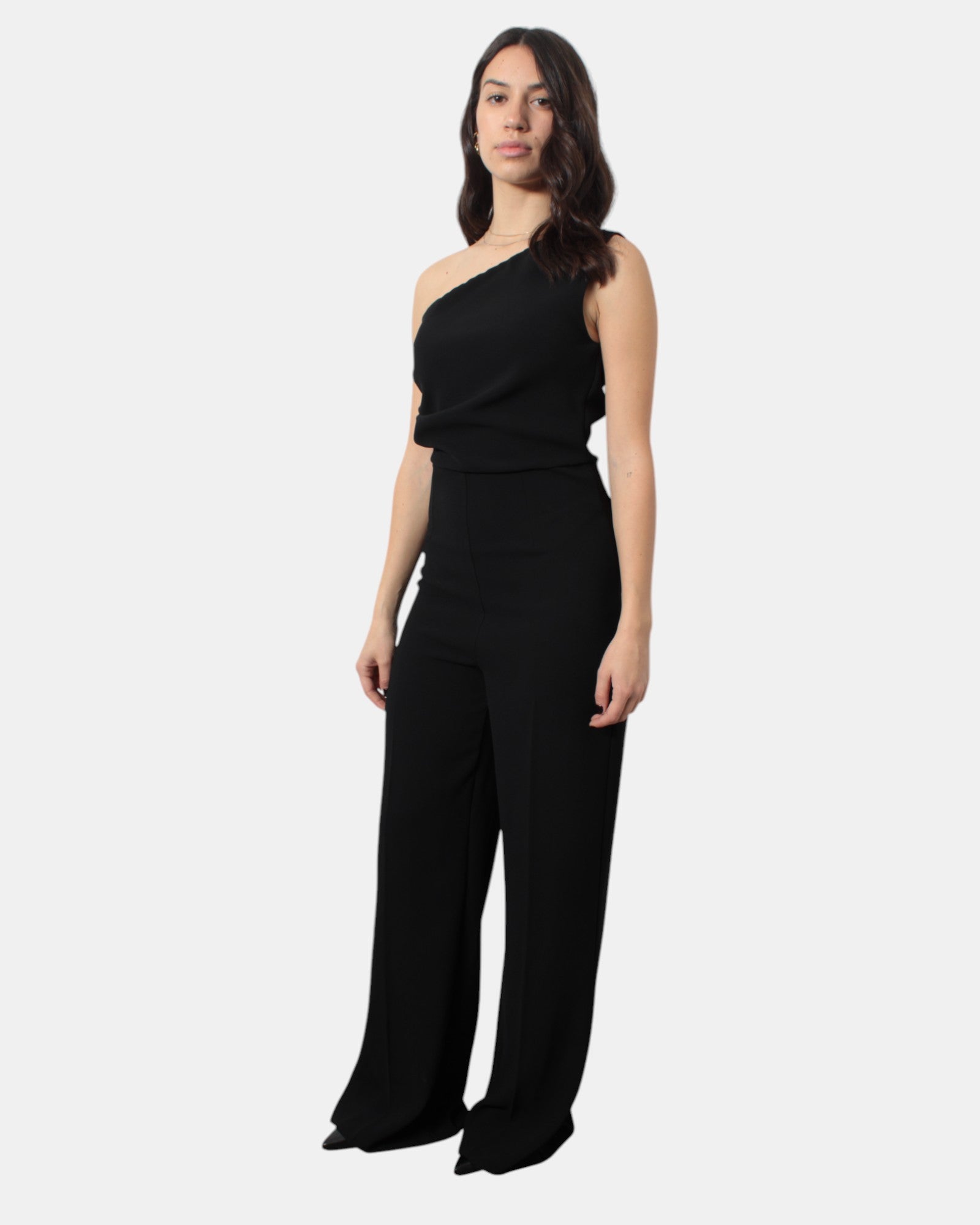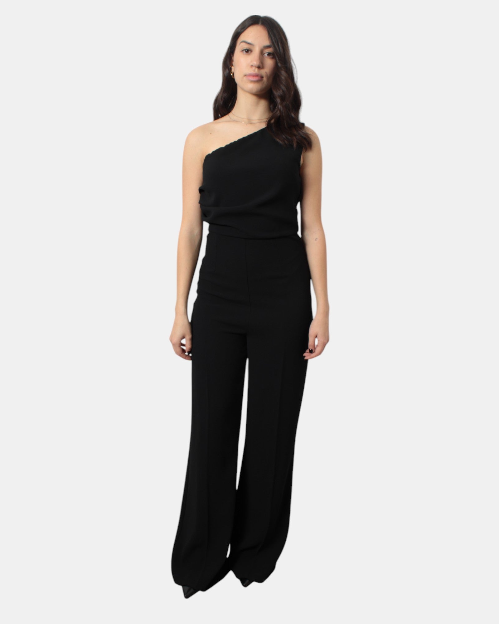 La tuta di Solotre presenta fantasia monocolore e scollatura obliqua, zip sulla gamba destra, dalla mano fresca dovuta alla sua composizione in 100% poliestere, si consiglia lavaggio a mssimo 30 gradi. La modella è alta 1,68 m e indossa una 40