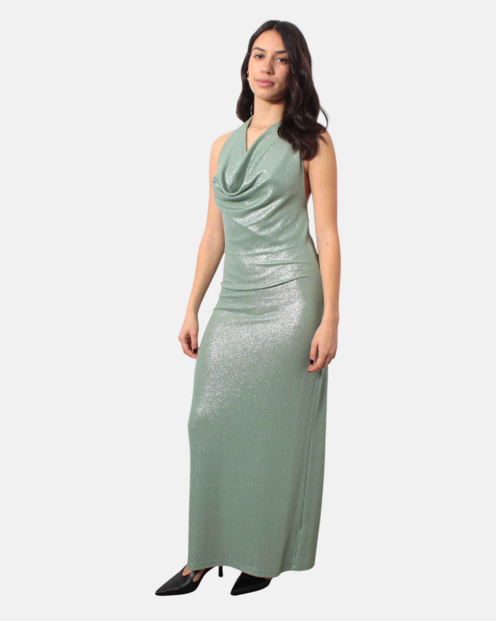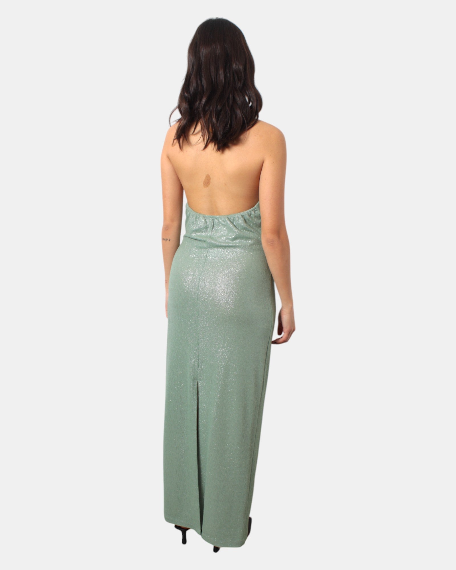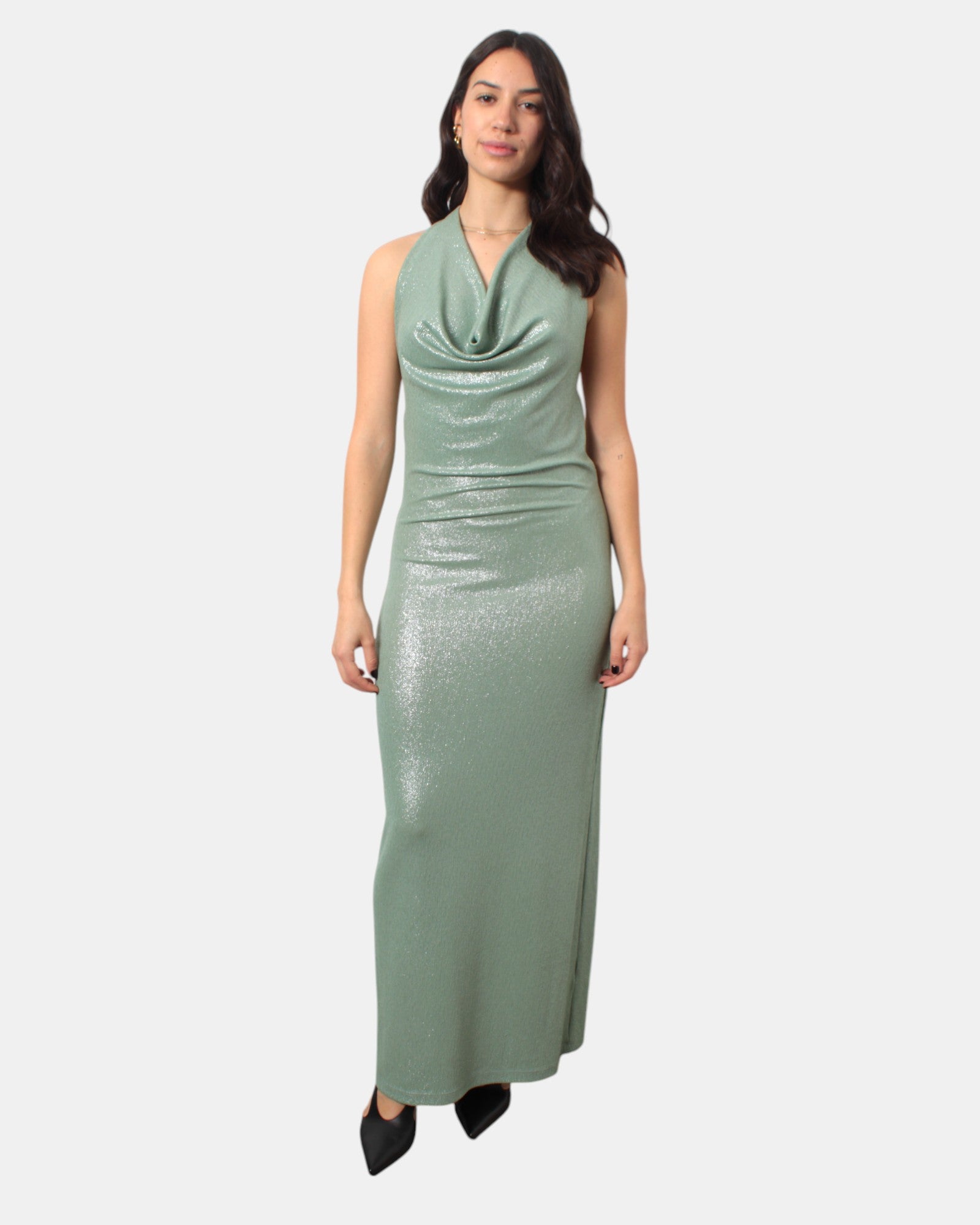 L'abito di Solotre presenta scollatura sulla schiena , spacco a V sul fondo, vestibilità aderente, fantasia glitterata, dalla mano fresca e morbida dovuta alla sua composizione in 95% poliestere e 5% elastan. Si consiglia lavaggio a massimo 30 gradi. La modella è alta 1,68 m e indossa una 42