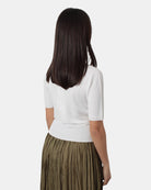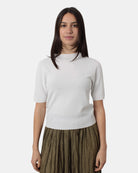 La maglia a girocollo di Solotre presenta collo, fondo e maniche a costine, dalla mano fresca dovuta alla sua composizione in 65% viscosa e 35% poliammid. SI consiglia lavaggio a mano. La modella è alta 1,68 m e indossa una 1