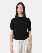 La maglia a girocollo di Solotre presenta collo, fondo e maniche a costine, dalla mano fresca dovuta alla sua composizione in 65% viscosa e 35% poliammide. SI consiglia lavaggio a mano. La modella è alta 1,68 m e indossa una 1