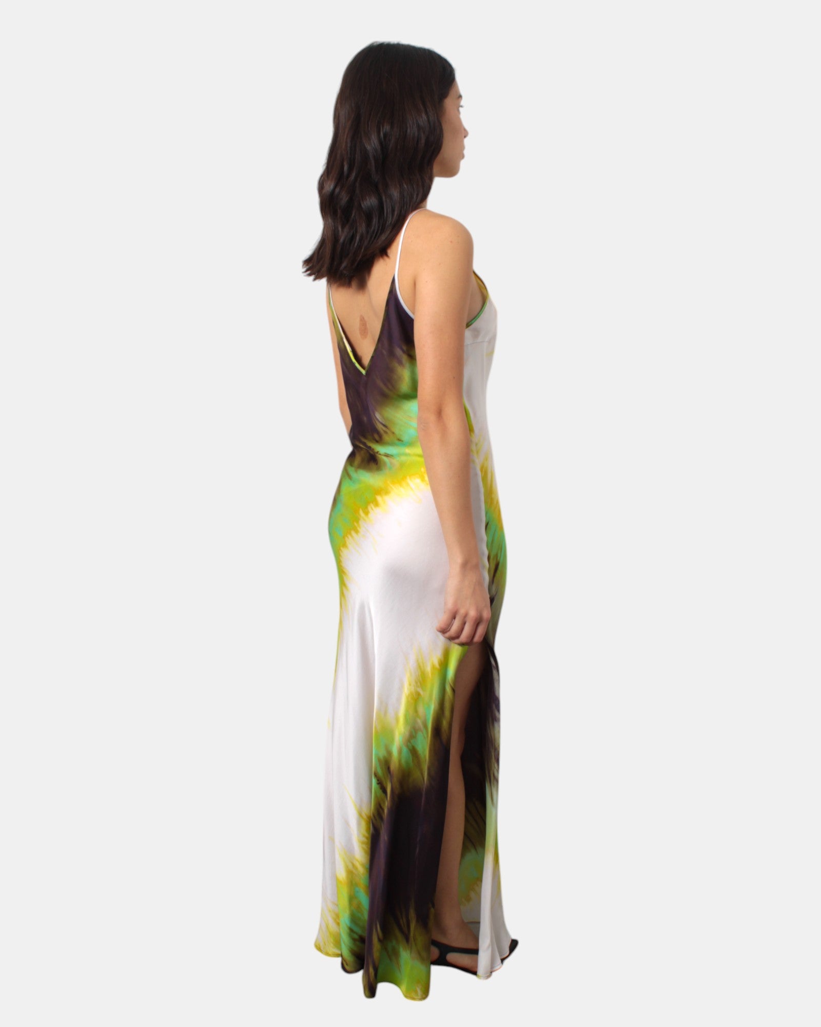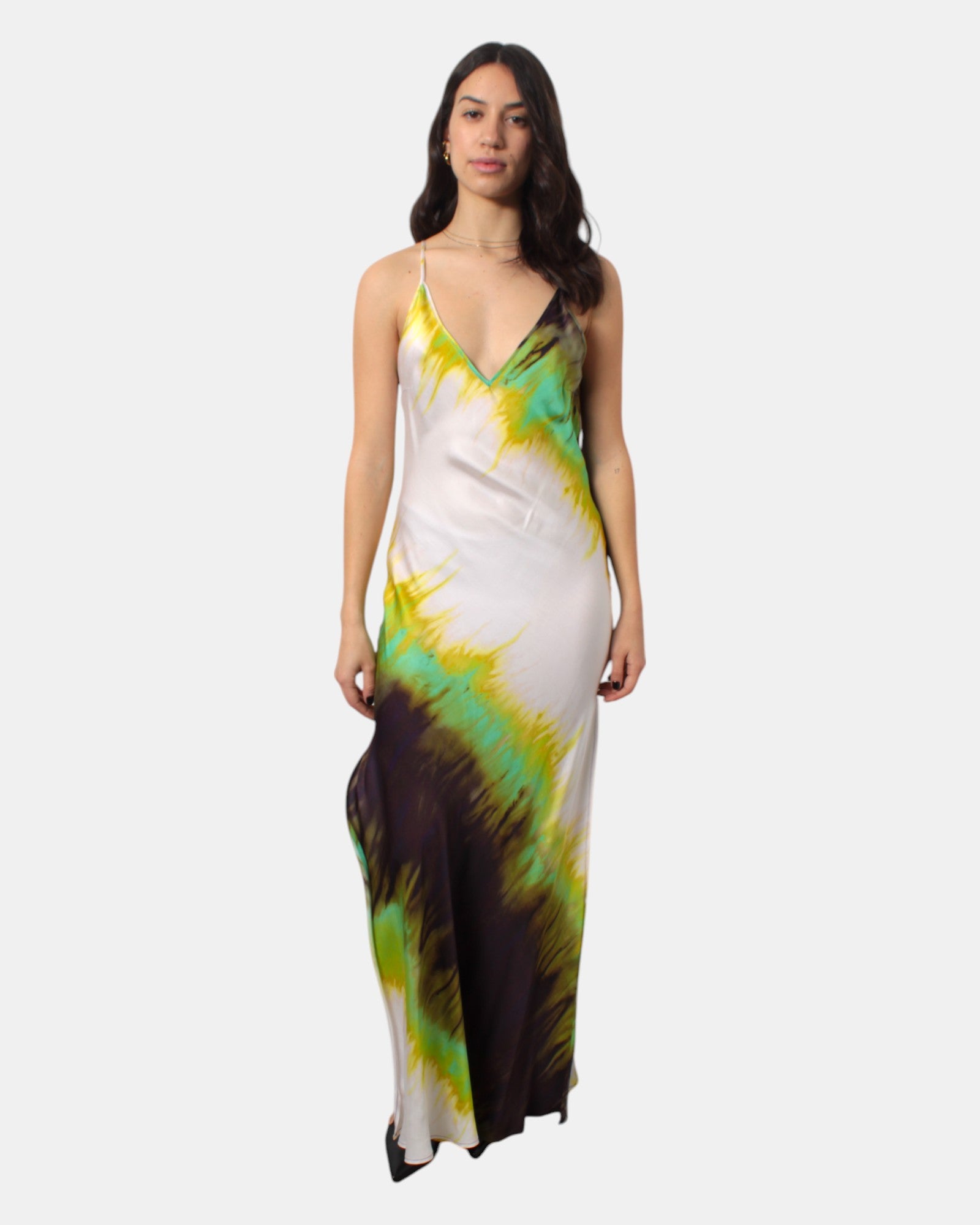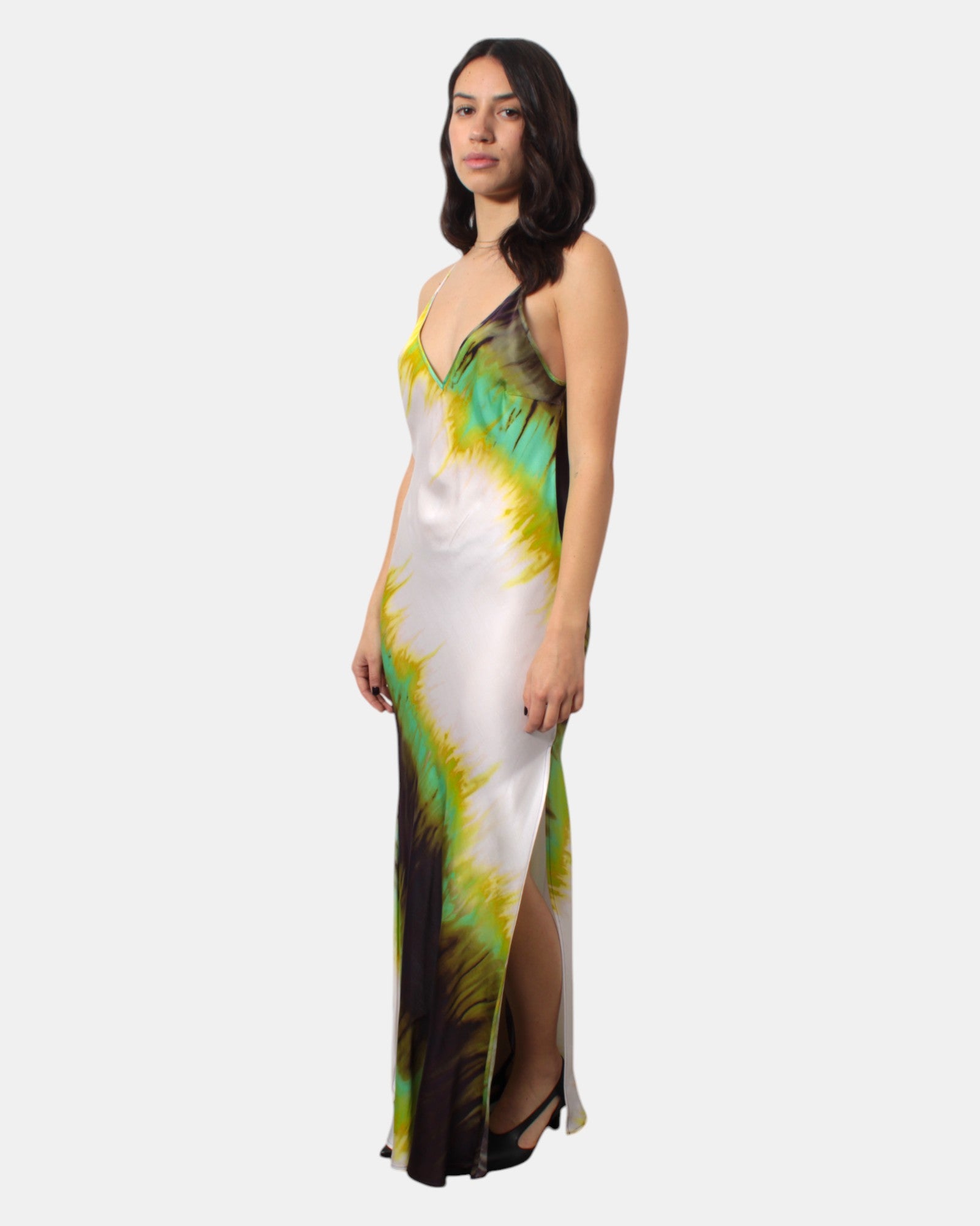 L'abito di Solotre presenta scollatura a V frontale e sul retro, spacco sulla gamba, fantasia multicolor, dalla mano fresca dovuta alla sua composizione in 100% poliestere. Si consiglia lavaggio a mano. La modella è alta 1,68 e indossa una 42