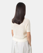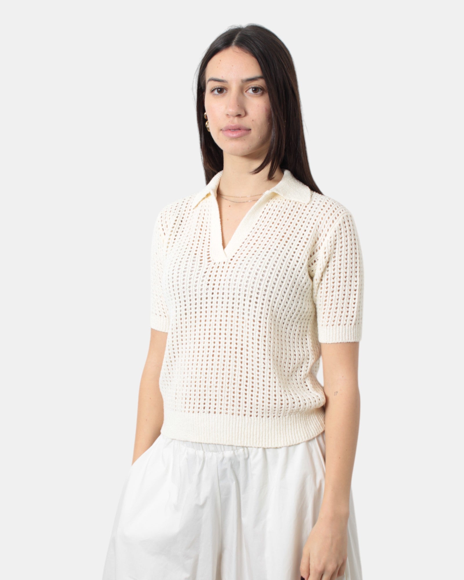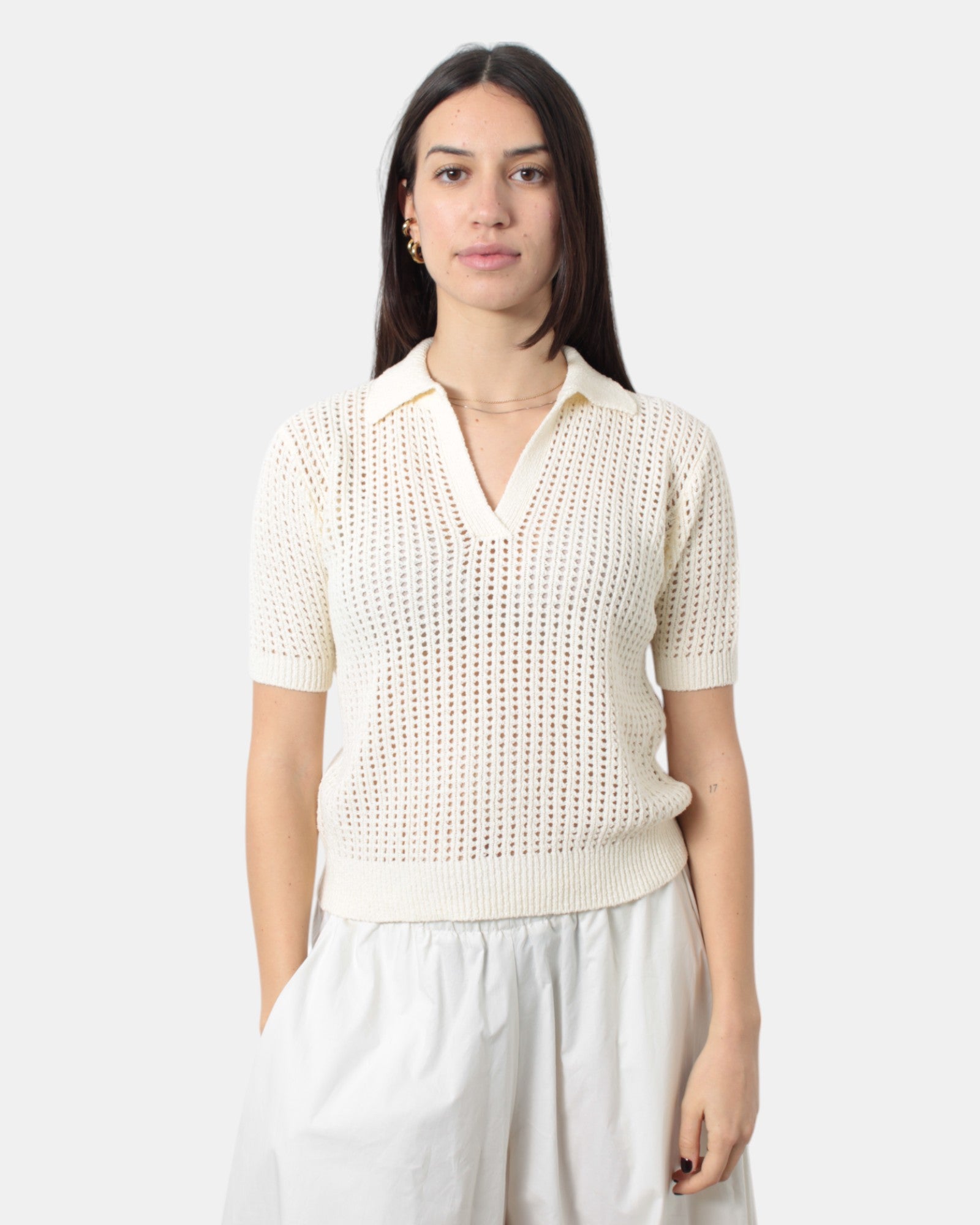 La polo a manica corta di Roberto Collina presenta scollo a V, collo, fondo e maniche a costine, fantasia traforata, dalla mano fresca dovuta alla sua composizione in 70% cotone e 30% fibra poliammidica. Si consiglia lavaggio a mano. La modella è alta 1,68 m e indossa una S