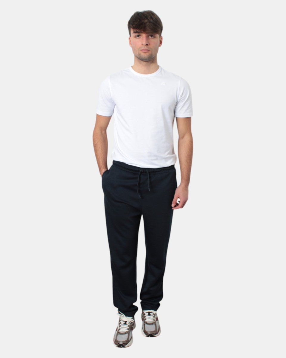 Il pantalone della tuta di K-way presenta elastico con coulisse in vita, logo brand sulla gamba sinistra, fantasia monocolore, dalla mano morbida dovuta alla sua composizione in 81% poliestere, 15% viscosa e 4% elastan. Si consiglia lavaggio a massimo 30 gradi. Il modello è alto 1,78 m e indossa una M