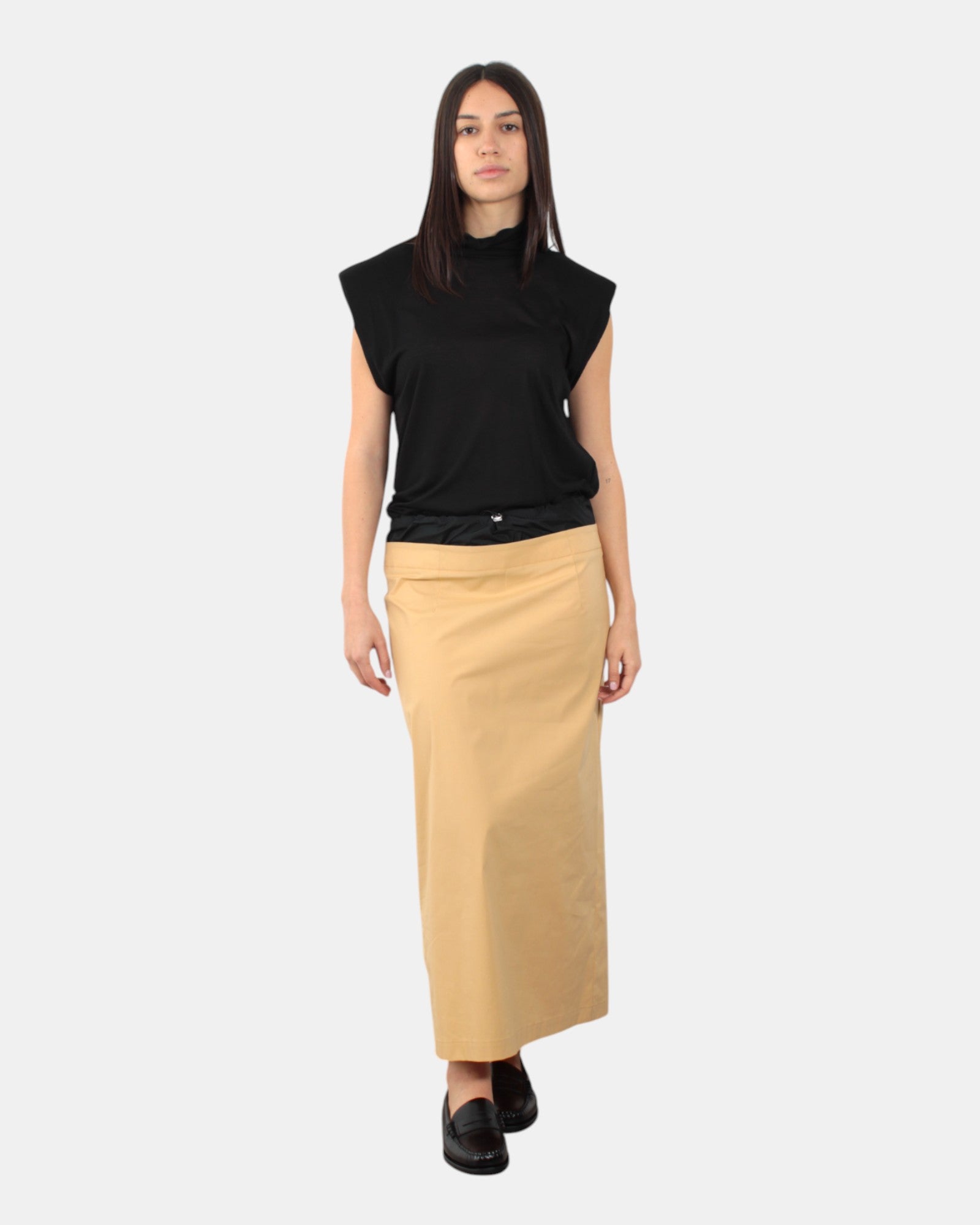 La gonna di Liviana Conti presenta elastico regolabile in vita con fodera interna in contrasto di colore, vestibilità ampia, dalla mano fresca dovuta alla sua composizione 64% cotone, 31% poliammide e 5% elastan. Si consiglia lavaggio a massimo 30 gradi. La modella è alta 1,68 m e indossa una 40