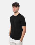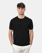 La maglia a girocollo a maniche corte di Kangra presenta, maniche, fondo e collo a costine, fantasia monocolore, dalla mano fresca e morbida dovuta alla sua composizione in 100% cotone. Si consiglia lavaggio a mano. Il modello è alto 1,78 m e indossa una 50