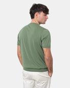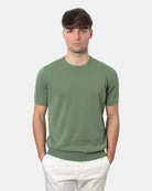 La maglia a girocollo a maniche corte di Kangra presenta, maniche, fondo e collo a costine, fantasia monocolore, dalla mano fresca e morbida dovuta alla sua composizione in 100% cotone. Si consiglia lavaggio a mano. Il modello è alto 1,78 m e indossa una 50