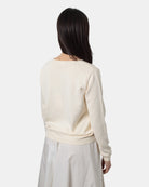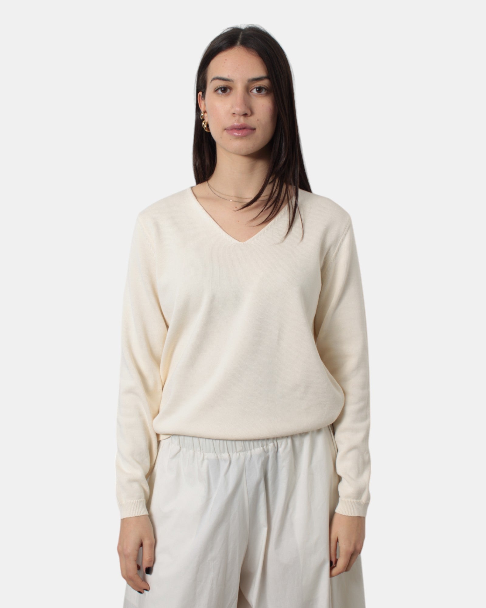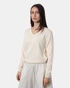 La maglia con scollo a V di Hekla&co presenta fondo e polsi a costine, fantasia monocolore, dalla mano fresca dovuta alla sua composizione in 100% cotone. Si consiglia lavaggio a mano . La modella è alta 1,68 m e indossa una S