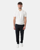 Il pantalone con elastico e coulisse di Michele Carbone presenta tasche frontali, due tasche a filetto sul retro, dalla mano morbida e fresca dovuta alla sua composizione in 54% poliestere, 44% lana 2% elastan. Si consiglia il lavaggio a bassa temperatura. Il modello è alto 1,78 m e indossa una 32