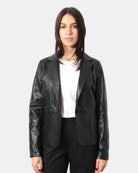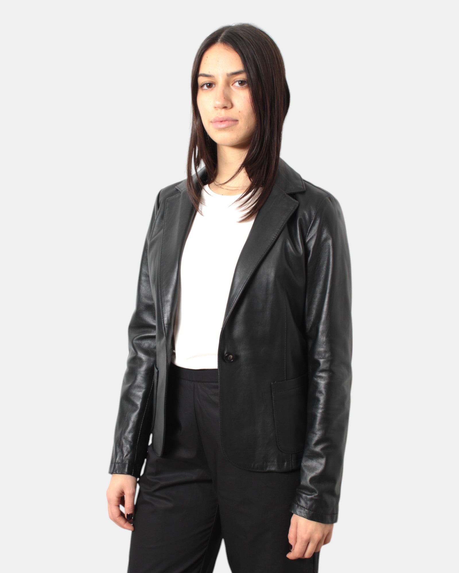 La giacca in pelle di The Jackie presenta chiusura a un bottone, due tasche a toppa, dalla mano fresca dovuta alla sua composizione in 100% pelle. Si consiglia il lavaggio in lavanderie specializzate. La modella è alta 1,68 m e indossa una 40