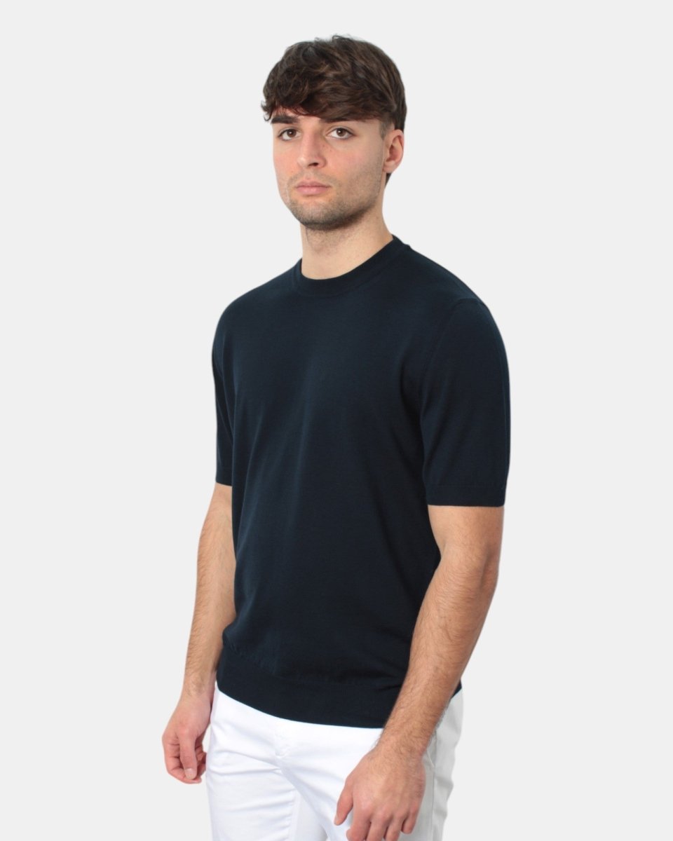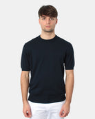 La maglia a girocollo a maniche corte di Altea presenta maniche, fondo e collo a costine, fantasia monocolore, dalla mano fresca e morbida dovuta alla sua composizione in 100% cotone. Si consiglia lavaggio a mano. Il modello è alto 1,78 m e indossa una L