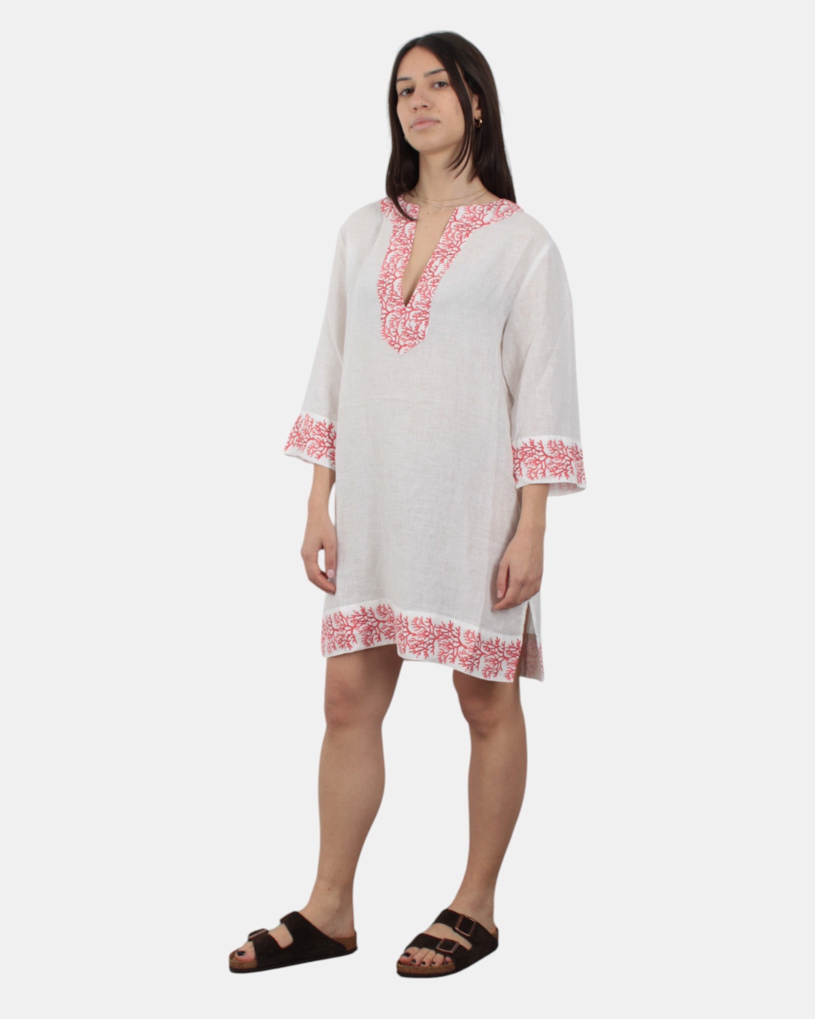 Il vestito di Academia presenta fantasia monocolore, con dettagli che rappresentano i coralli, due spacchetti laterali sulò fondo, dalla mano fresca dovuta alla sua composizione in 100% lino. Si consiglia lavaggio a mano. La modella è alta 1,68 m e indossa una S