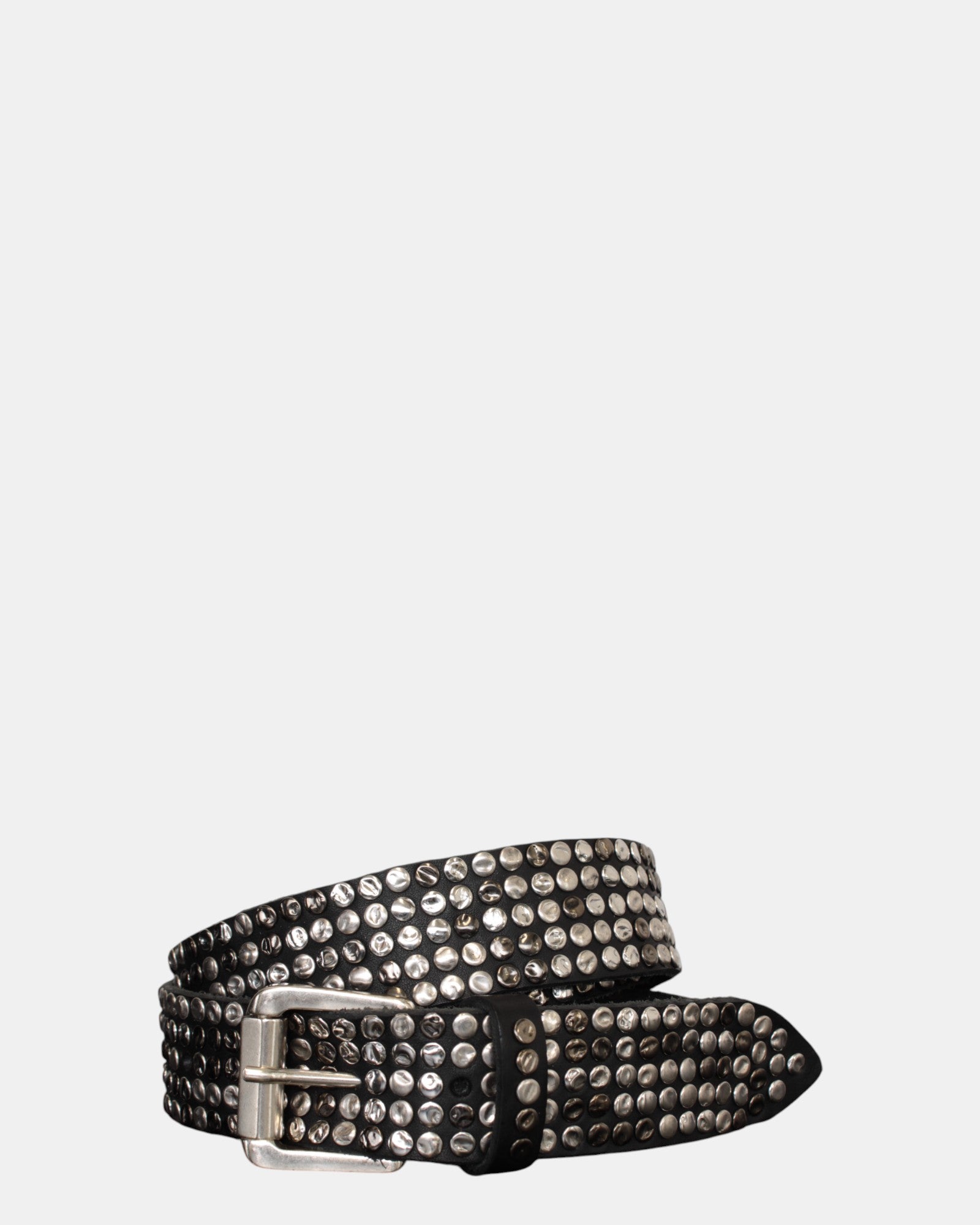 La cintura in pelle di Alberto Luti presenta fantasia borchiata e composizione in pelle, con chiusura con fibbietta in argento