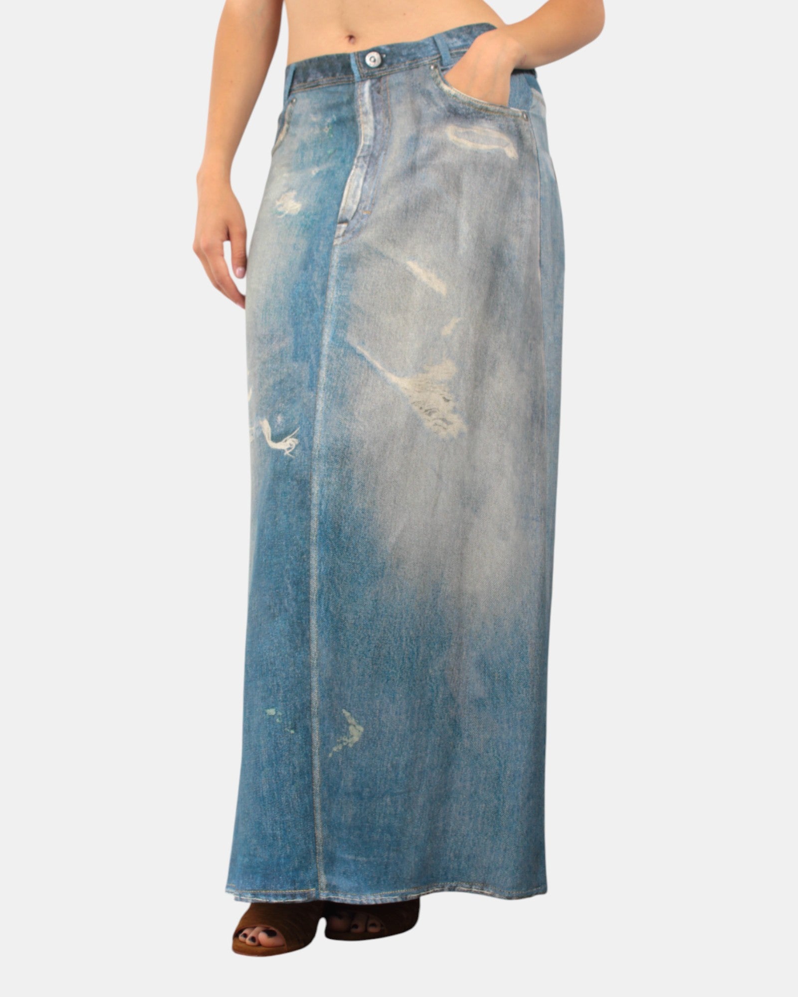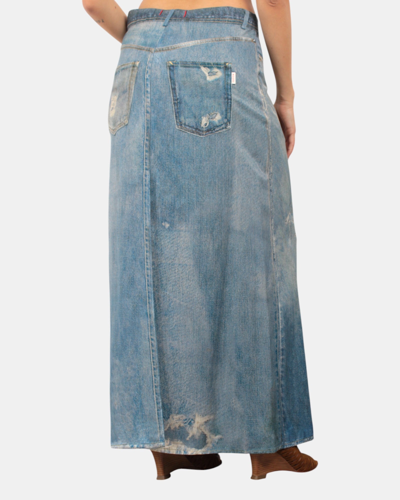 La gonna Jucca presenta passanti per cintura, chiusura frontale con bottone a pressione e zip, e cinque tasche. Realizzata in 77% viscosa e 23% lino. Si consiglia lavaggio delicato a massimo 30 gradi. La modella è alta 1,68 e indossa una 40.