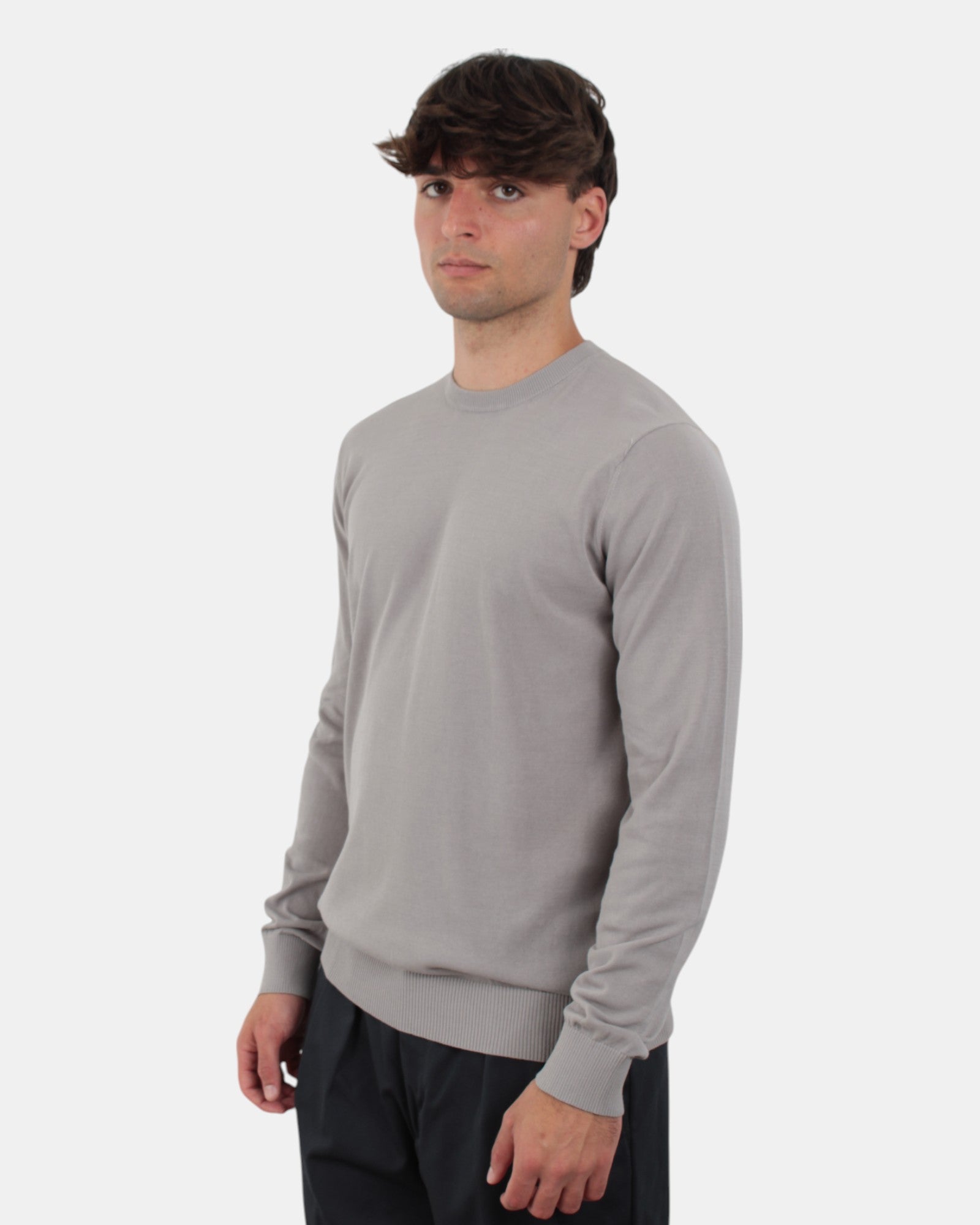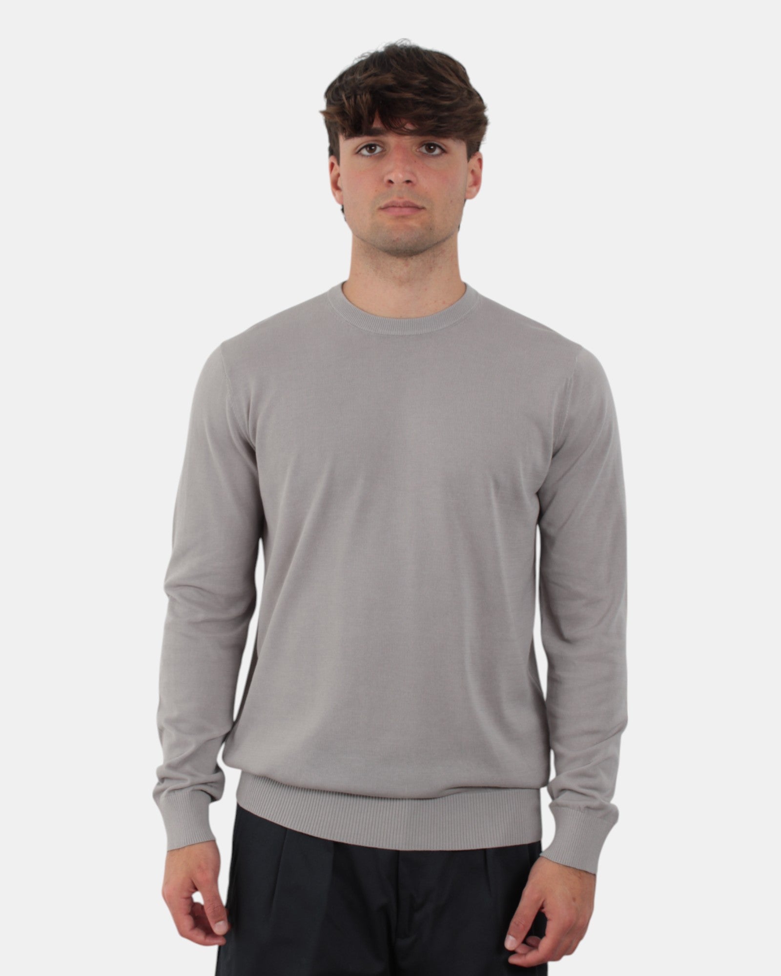 La maglia a girocollo a manica lunga di Della Spiga presenta collo, fondo e manica a costine, fantasia monocolore, dalla mano fresca dovuta alla sua composizione in 100% cotone. SI consiglia lavaggio a massimo 30 gradi. Il modello è alto 1,78 m e indossa una 50