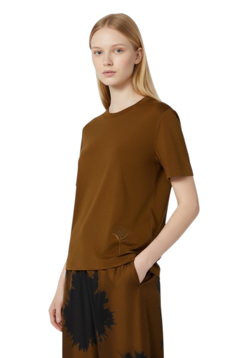 Perfetta da indossare da sola o sotto un blazer, questa blusa in maglia si presta a molteplici interpretazioni: dal look casual chic con jeans, a un outfit più sofisticato con pantaloni sartoriali. Il tessuto a maglia, composto da 51% modal e 49% cotone, garantisce traspirabilità, morbidezza e resistenza, rendendo questa T-shirt un must-have per il guardaroba femminile.