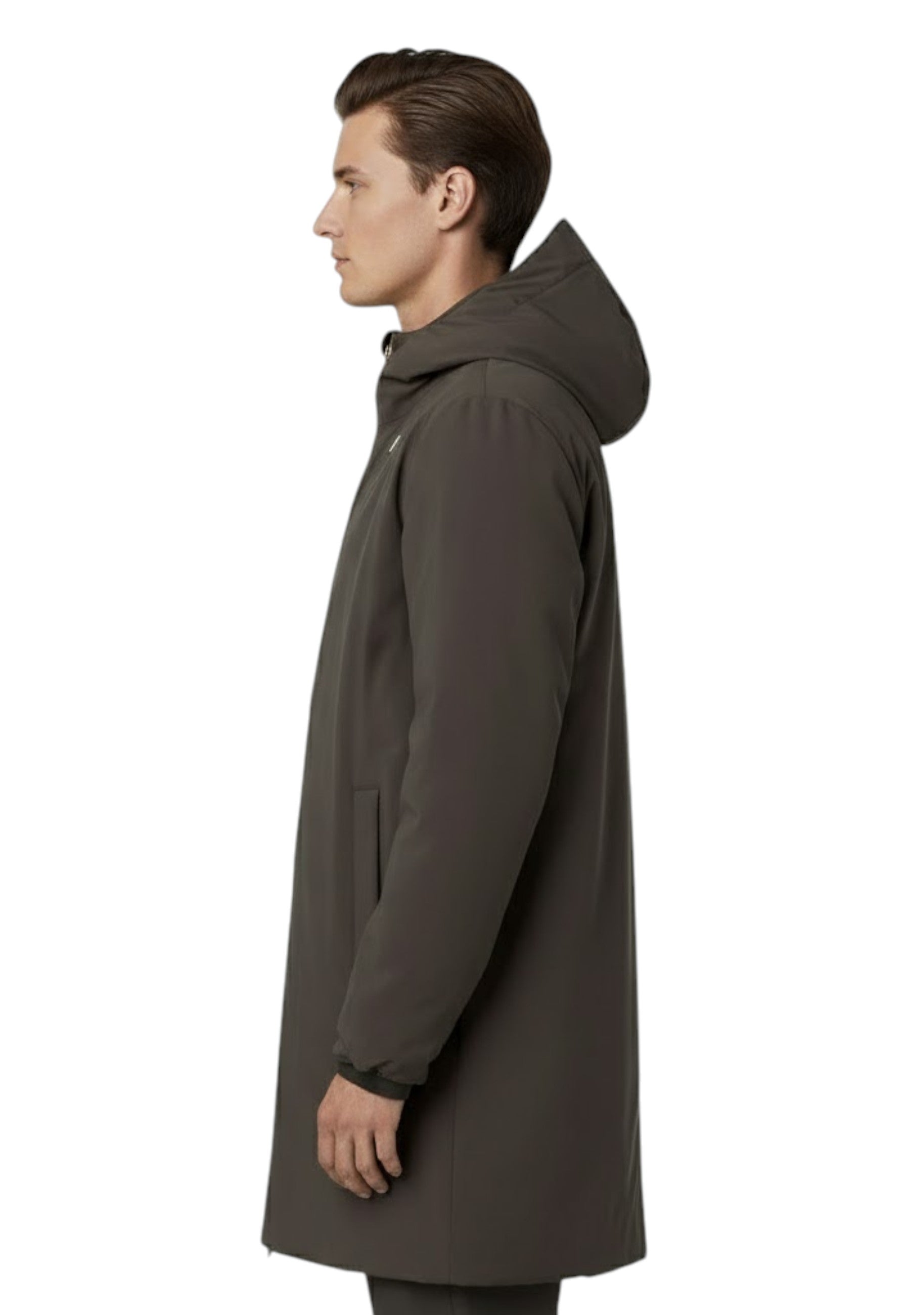 Completano il modello dettagli pratici come il cappuccio regolabile con corda elastica, polsini elasticizzati, chiusura zip, due tasche con zip e due tasche con bottoni a pressione. Il fitting regolare assicura libertà di movimento, mentre il logo in silicone bianco firma il capo con eleganza sobria.
