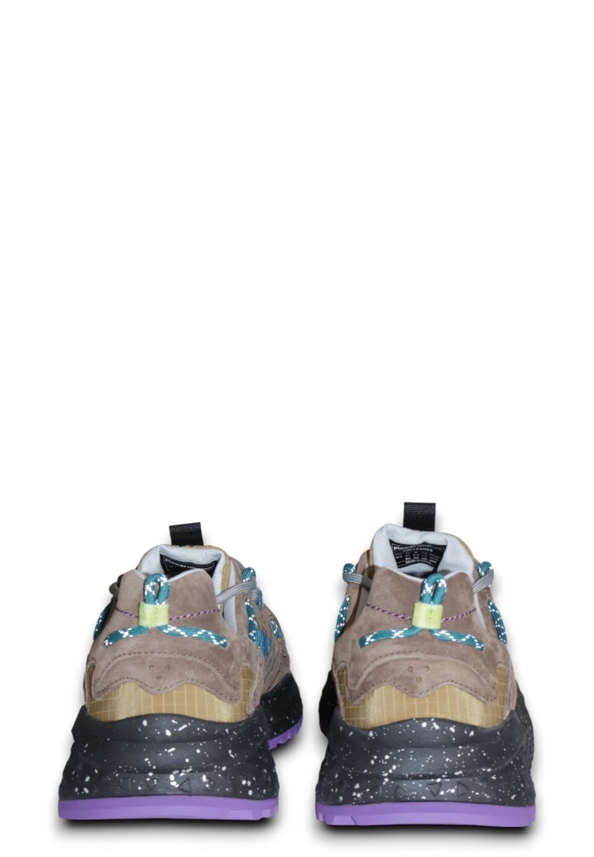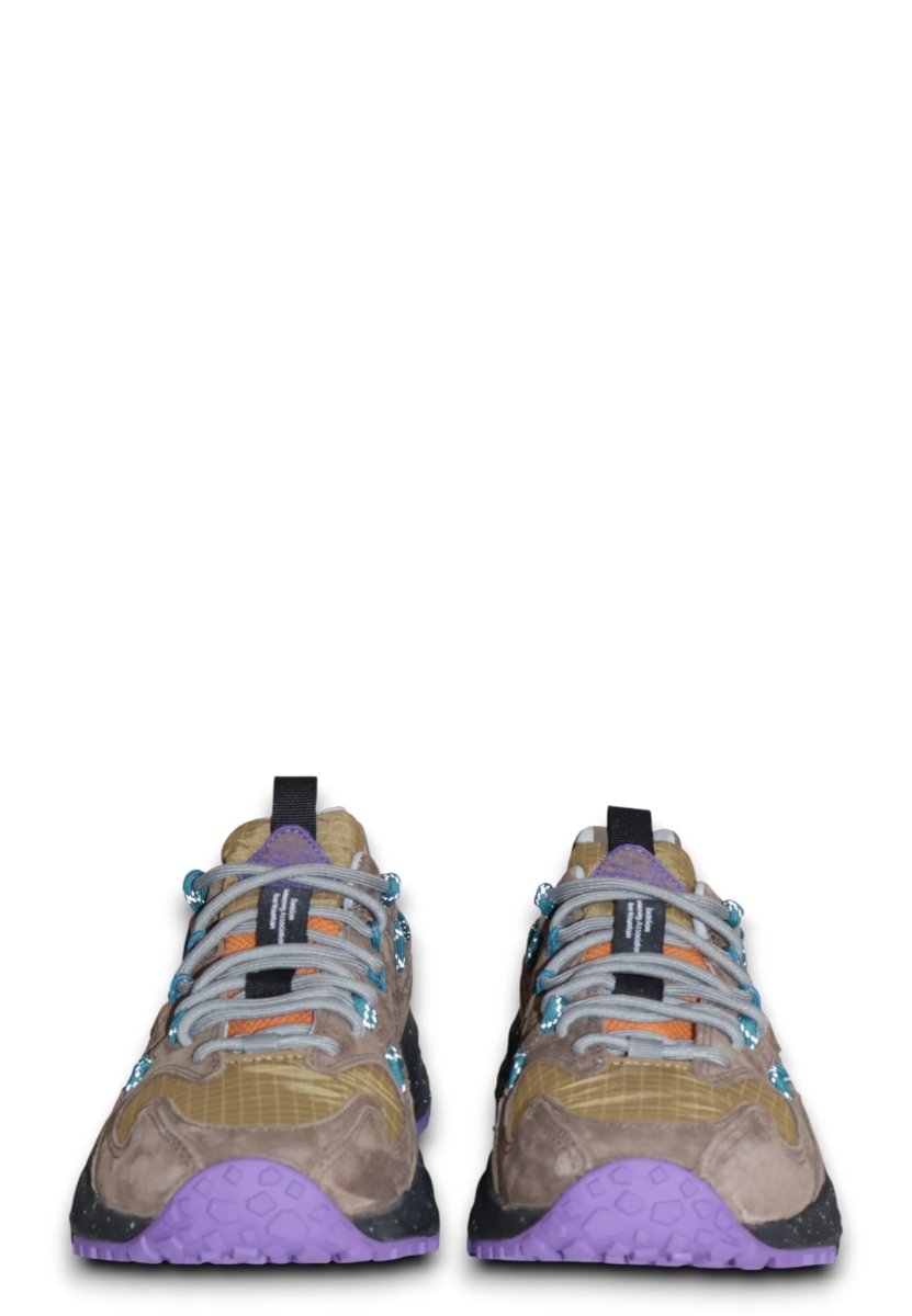 Le stringhe tubolari tecniche si sviluppano sui fianchi creando un gioco di occhielli a contrasto, che richiama l’estetica del trail ma con una sensibilità fashion. L’interno è foderato in pelle e tessuto per un tocco di qualità superiore, mentre la soletta anatomica in sughero naturale antibatterico garantisce igiene e comfort prolungato.