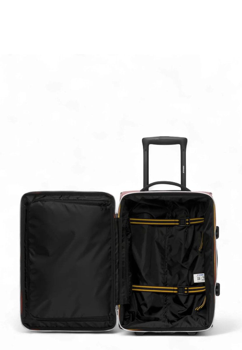 All’interno, gli scomparti multifunzionali consentono di organizzare al meglio il contenuto, mentre le regolazioni laterali permettono di ottimizzare lo spazio. Completano il design la chiusura con zip K-Way a doppio cursore, la bustina di riconoscimento agganciabile e il logo K-Way in silicone bianco, discreto ma riconoscibile.
