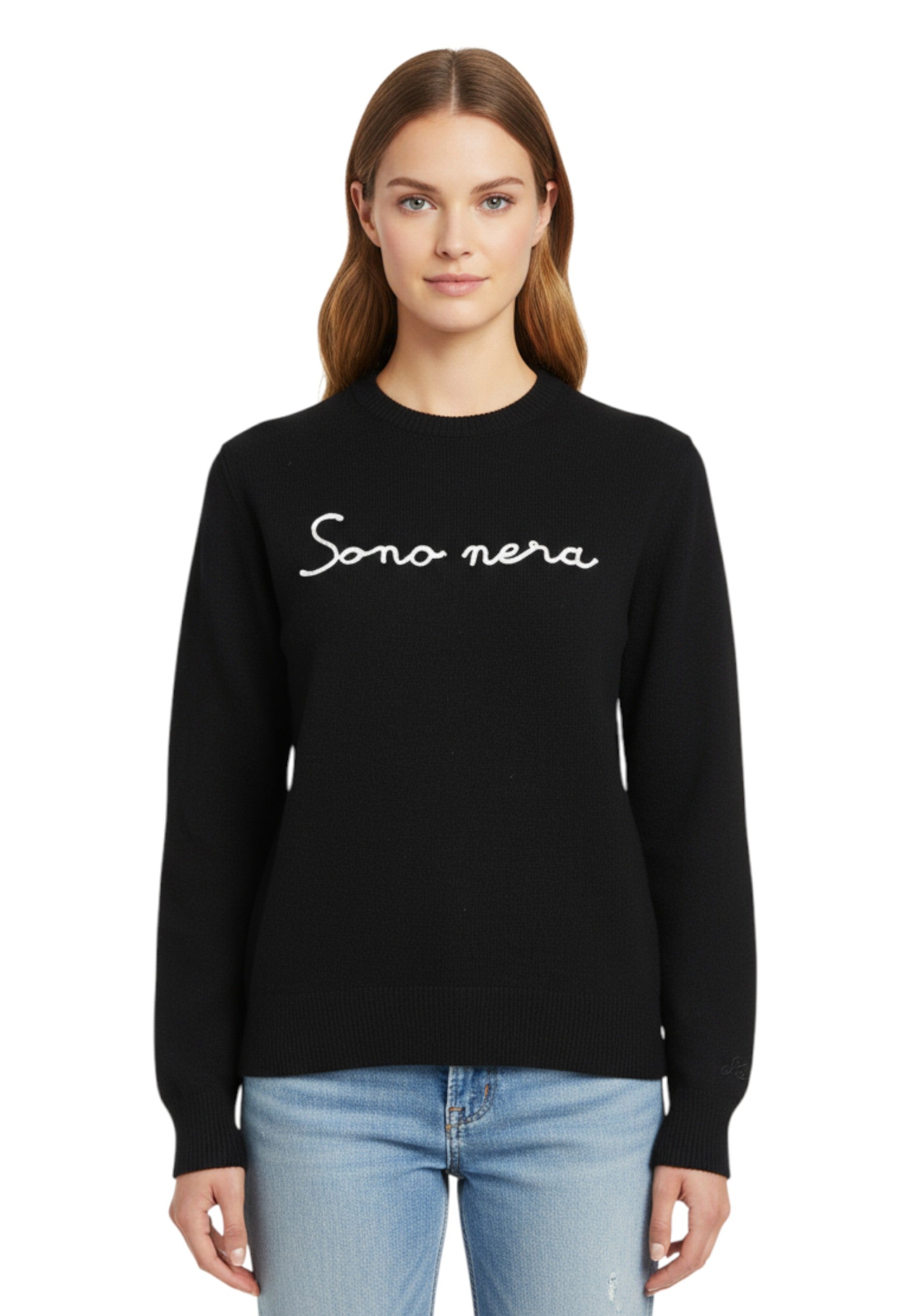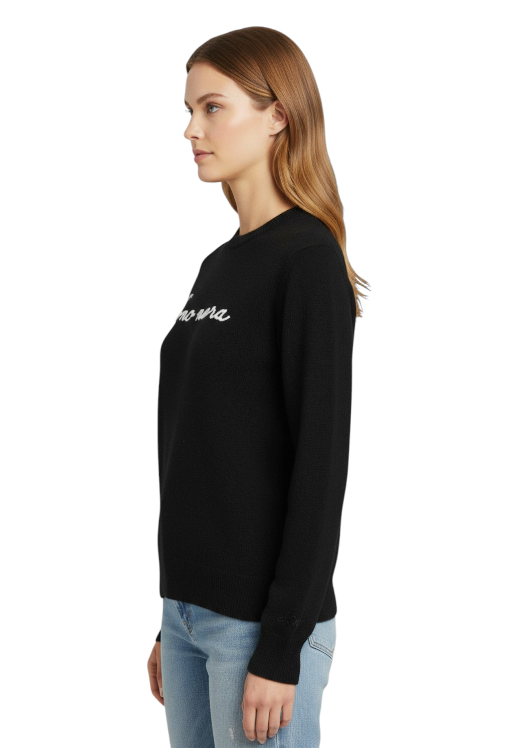 Realizzato con una miscela di lana e cashmere, questo maglione offre calore e comfort senza rinunciare allo stile. Il colore nero, abbinato alla scritta ricamata sul davanti, dona un tocco di originalità al tuo look, mantenendo al contempo un aspetto sobrio e raffinato.