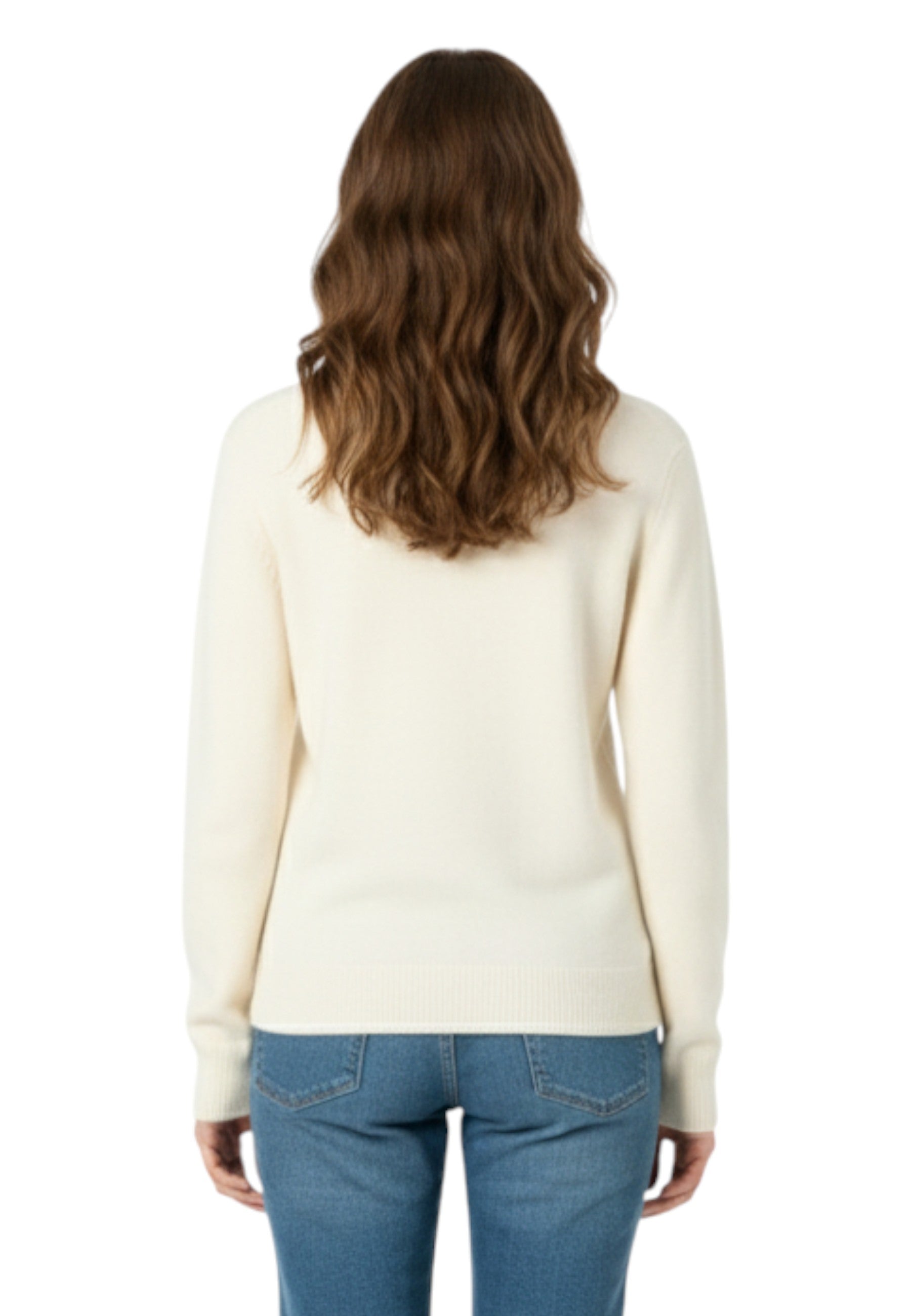 Lavorato a maglia rasata finezza 7gg, questo girocollo a manica lunga in misto cashmere avvolge con una vestibilità regolare e dettagli curati come collo, fondo e polsini a coste. Un capo che unisce eleganza e spirito giocoso, ideale da indossare h24, dal brunch all’aperitivo.