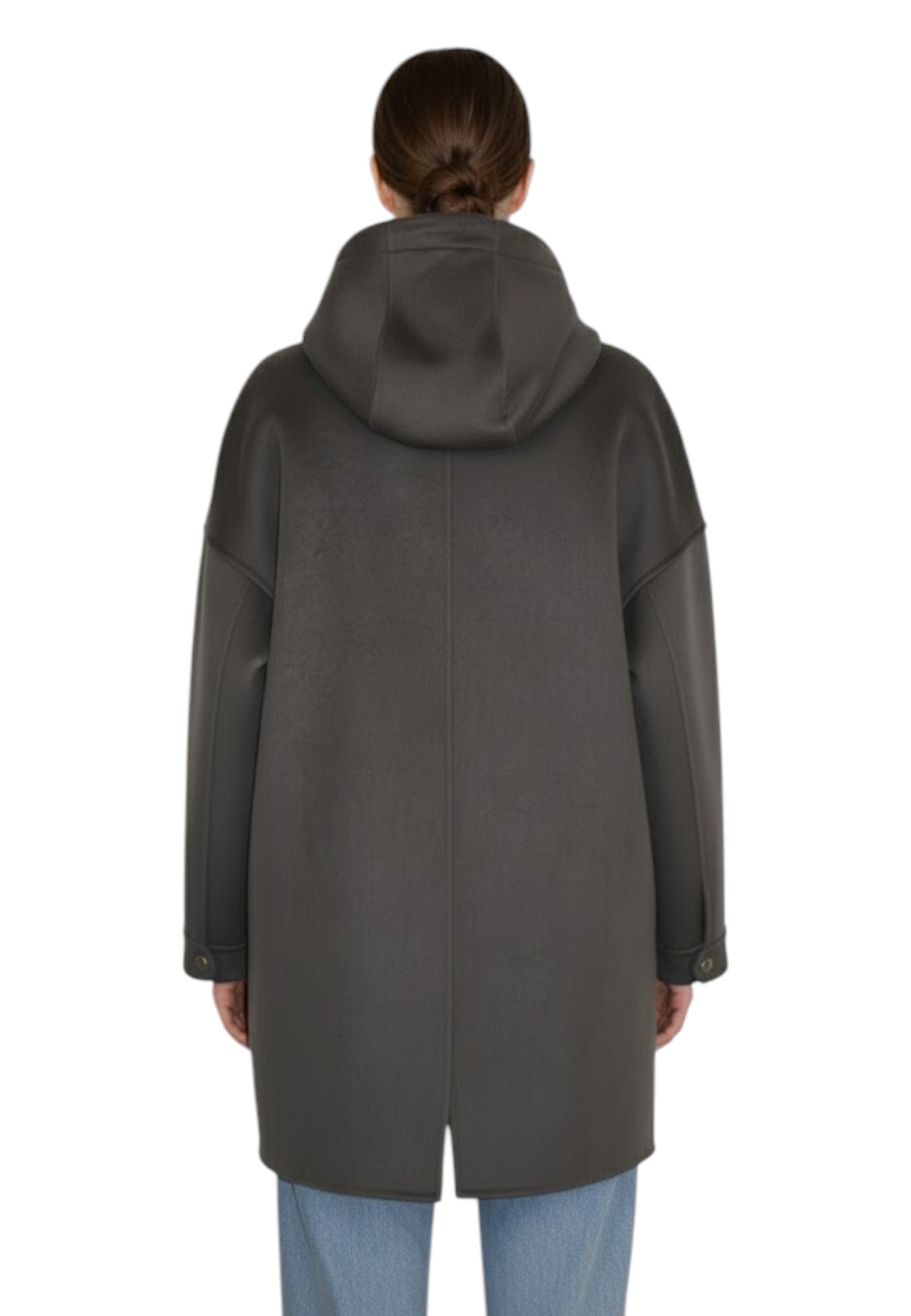 Questa giacca è realizzata con un tessuto misto che combina la calda lana con la praticità del poliestere, garantendo comfort e durata nel tempo. Il design con cappuccio e linee pulite conferisce un look moderno e sofisticato, perfettamente abbinabile con jeans per un outfit casual o con un abito elegante per un look più formale.